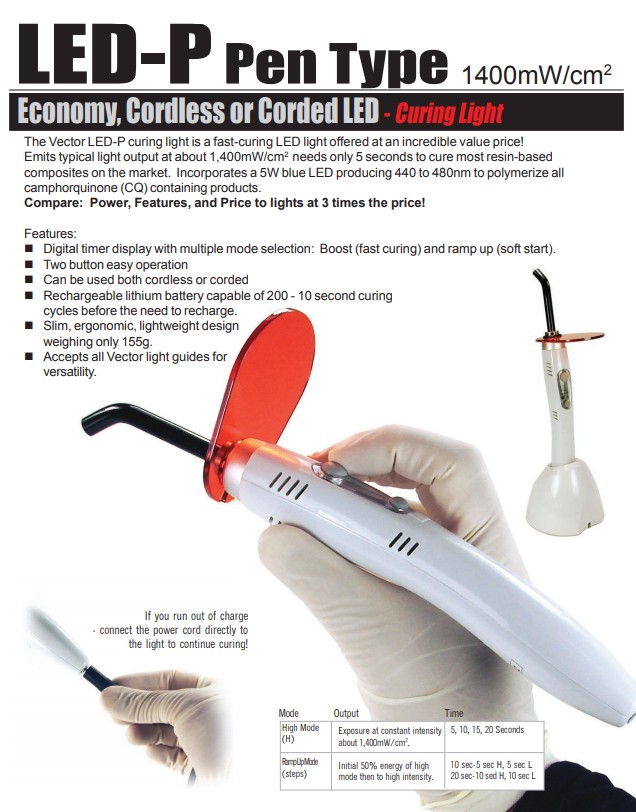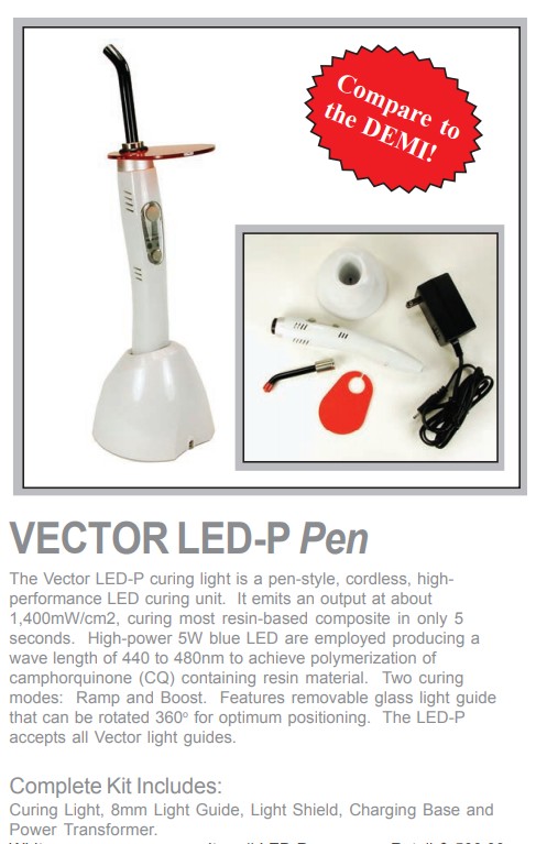 The Vector LED-P curing light is a fast-curing LED light offered at an incredible value price! Emits typical light output at about 1,400mW/cm2 needs only 5 seconds to cure most resin-based composites on the market. Incorporates a 5W blue LED producing 440 to 480nm to polymerize all camphorquinone (CQ) containing products. Compare: Power, Features, and Price to lights at 3 times the price! Features:
