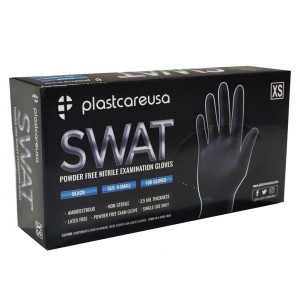 PlastCare USA Swat Black Nitrile Gloves feature textured fingers, fingertips and palms, providing an excellent non-slip grip when handling dental or medical tools and instruments. These durable gloves are 100% silicone and latex free. With more durability and a more comfortable fit than latex, these puncture resistant nitrile gloves are made of synthetic latex to prevent rashes, hives, and itchy skin. Disposable for one time use. Black Nitrile gloves feature a beaded cuff for easy removal.