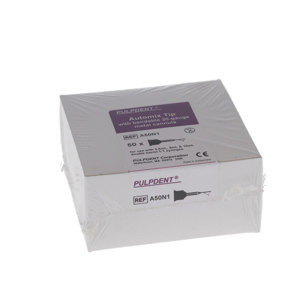 Activa Automix Tips are 20-Gauge needle tips designed with a bendable metal cannula. Use automix tips for 2.5-ml, 5-ml, and 10-ml 1:1 automix syringes and with Activa BioActive Restorative, Base/Liner, and Cement.