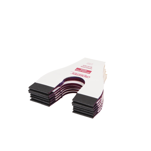 Articulating Paper uses a film-foil-paper combination and undergoes quality control to register precise occlusions, despite surface moisture levels. Articulating Strips come with color-coded text on the boxes to distinguish between the variations: thick, thin, extra thin, xx thin, straight, curved, curved with tabs, horseshoe.