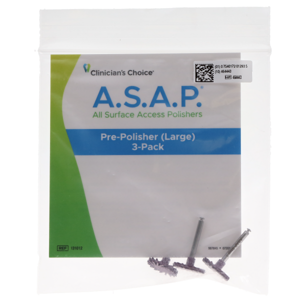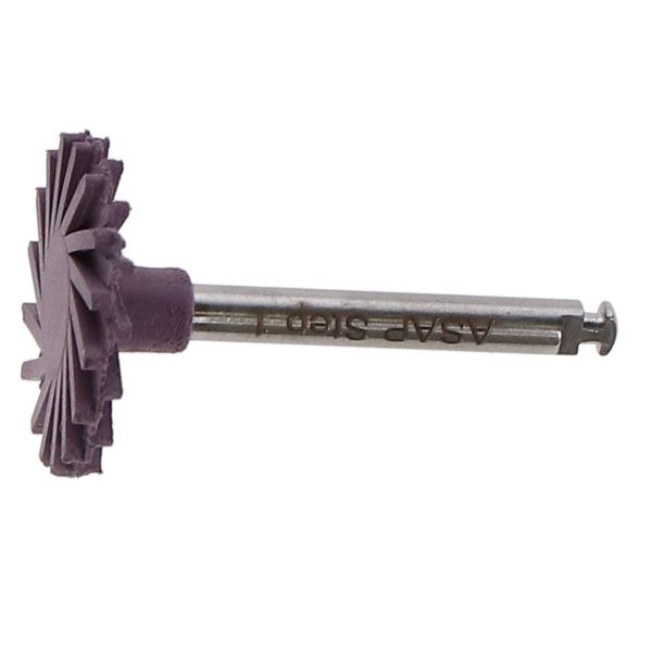 The A.S.A.P. Pre-Polisher (purple) is embedded with diamond particles (44 microns) and gently diminishes small surface defects, without affecting anatomy. Ideal for use on all composite surfaces, lithium disilicate, zirconia, bisacryls, and some ceramic materials
