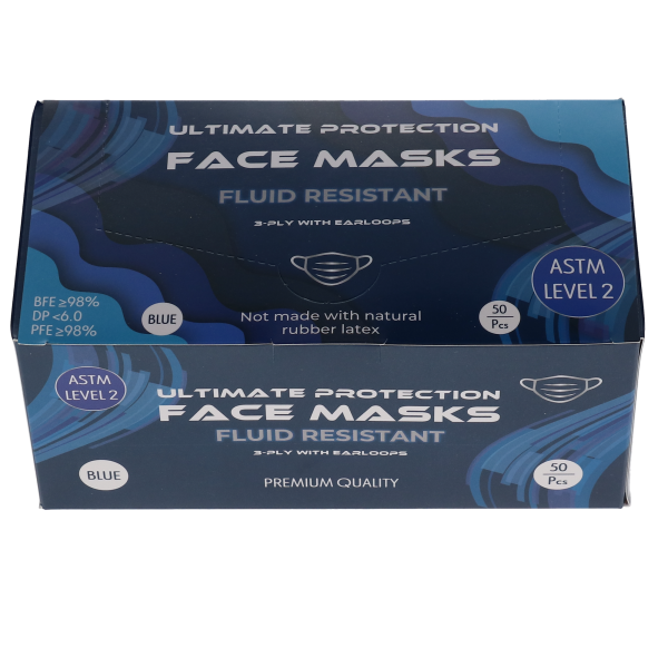 Earloop 3-PLY Masks 50/Bx ASTM Level 2 Blue ideal for use in public and crowded indoor areas, medical facilities and manufacturing facilities, our masks offer comprehensive protection from airborne particles such as dust, dirt and pollen. The mask's pleated design is breathable and flexible for added comfort.