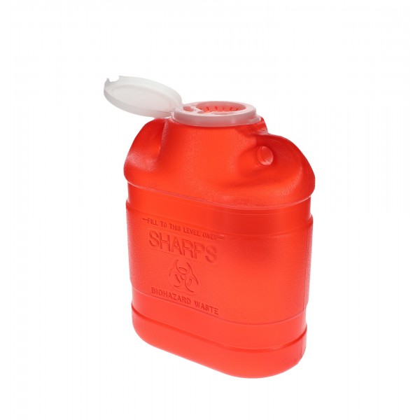 The clear lid and fill-to-line marking provide sufficient content visibility to indicate the placing of additional sharps. Following OSHA requirements, Multi-Use One-Piece Sharps Collector is labeled with a hazard sign to ensure careful handling.
