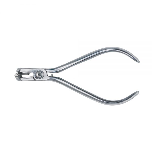 Cuts “flush” to the distal end of the buccal tube. The wide spring steel clip holds and catches the wire throughout cutting. Cuts wire up to .018″ x .025″