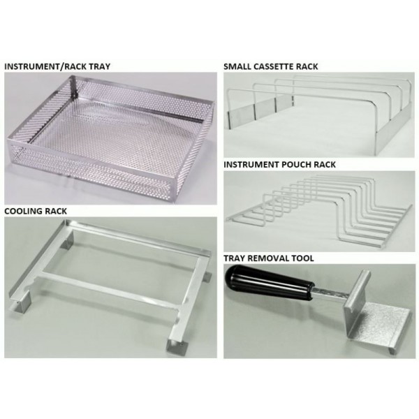 INCLUDED WITH COX 6000: Instrument/Rack Tray (size: 9"x7.5"x1"), Small Cassette Rack, Instrument Pouch Rack, Cooling Rack, Tray Removal Tool