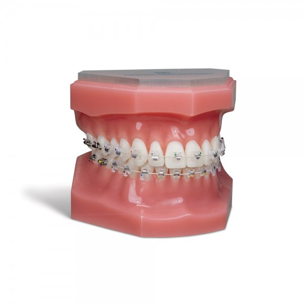 The typodont comes fully set up with brackets bonded from 7 to 7, pre-inserted archwires, and buccal tubes on both upper and lower first and second molars. Clear ligatures are included for an authentic look. The model is constructed with a gingiva-colored solid tissue base and tooth-tone colored teeth, molded and individually inserted for lifelike detail. A durable hinged mechanism allows repeated demonstrations without loss of stability.