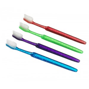The Teen Sparkle Toothbrush has a Power Tip with 35 tufts of end-rounded bristles and a fun sparkle design. These brushes are available for imprinting and come in green, purple, red, and blue; minimum order of 1 box, 144 per box.
